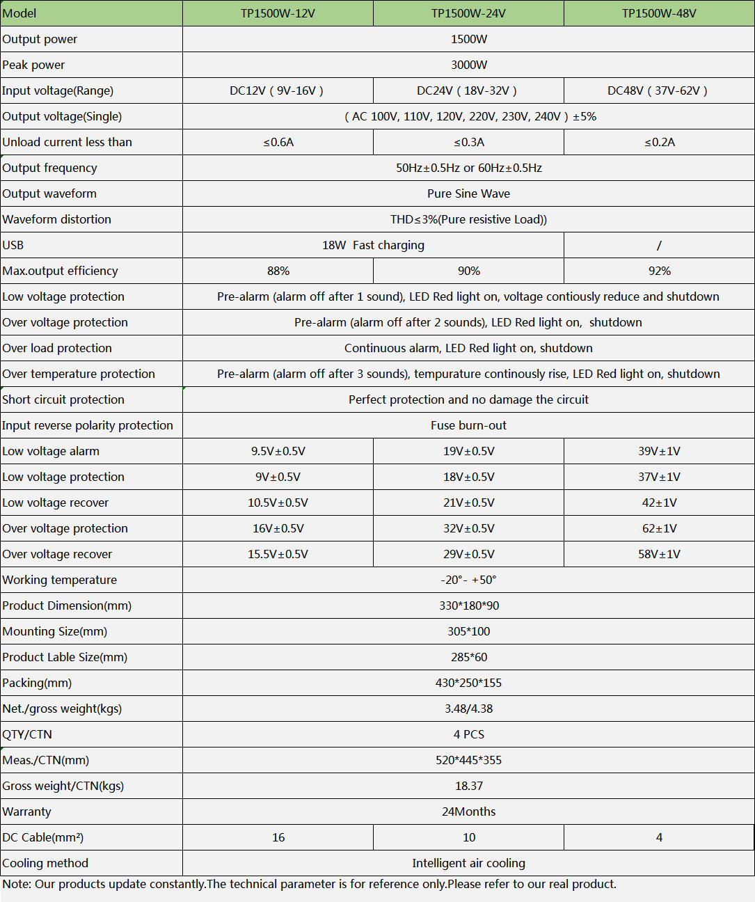 首先对照一下产品尺寸,净重,再对照一下产品带载的表现。我们的500W, 1000W, 1500W, 2000W, 3000W, 5000W有专门拍摄了逆变器的带载情况,可供参考。