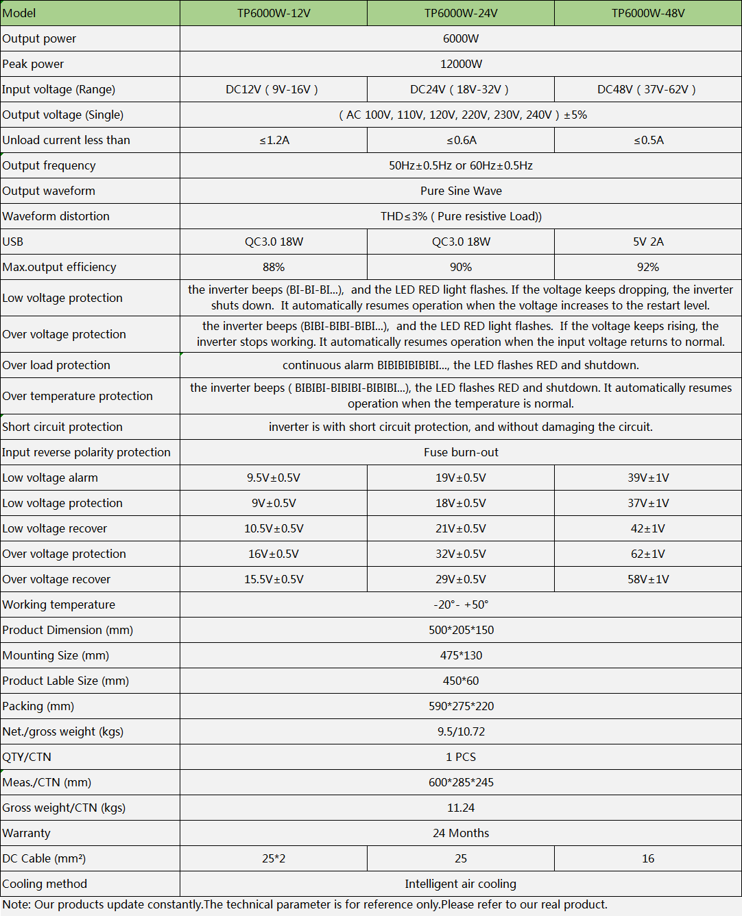 首先对照一下产品尺寸,净重,再对照一下产品带载的表现。我们的500W, 1000W, 1500W, 2000W, 3000W, 5000W有专门拍摄了逆变器的带载情况,可供参考。